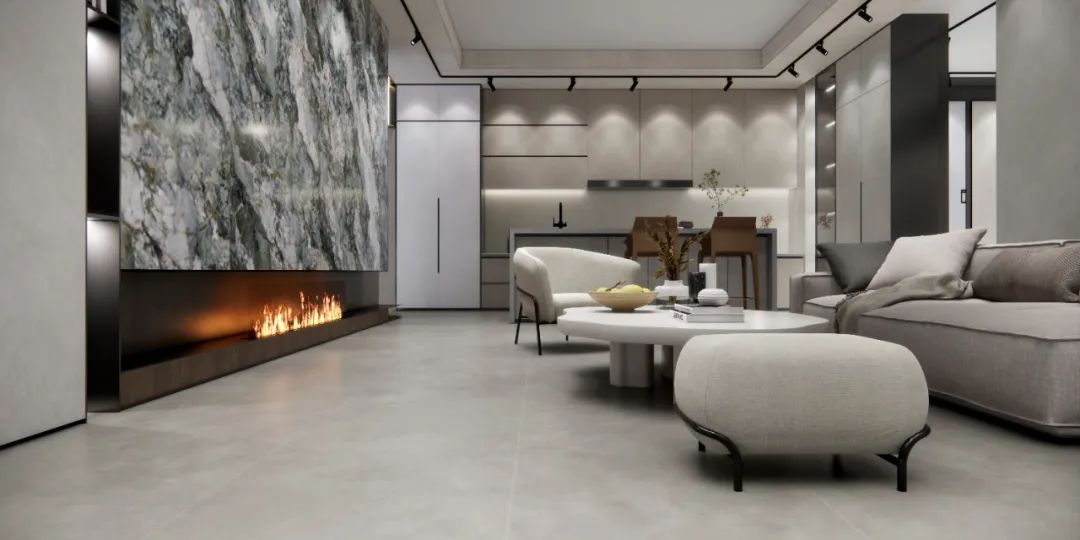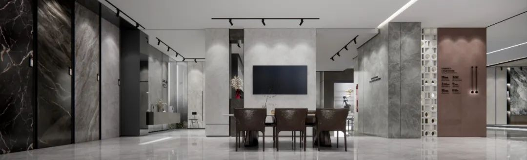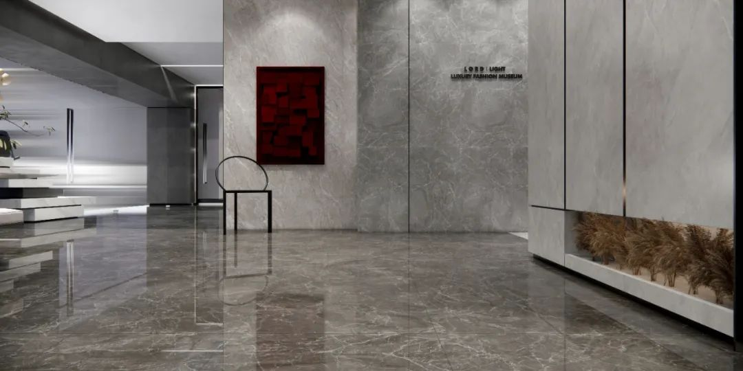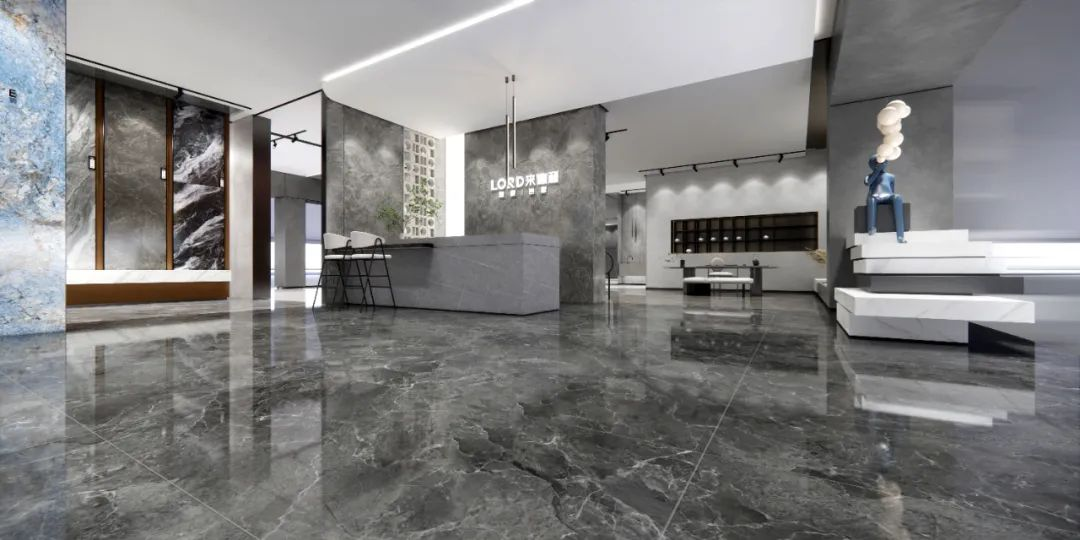 看!高级深灰色调的地面+浅灰洽谈区标准,简单而通透,加上瓷砖的独特质感,将空间点缀在自然中,更显国际风范的高贵。