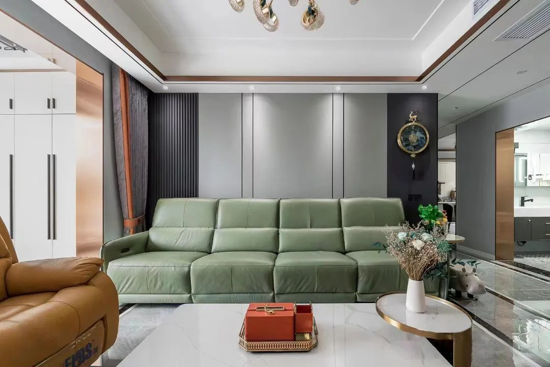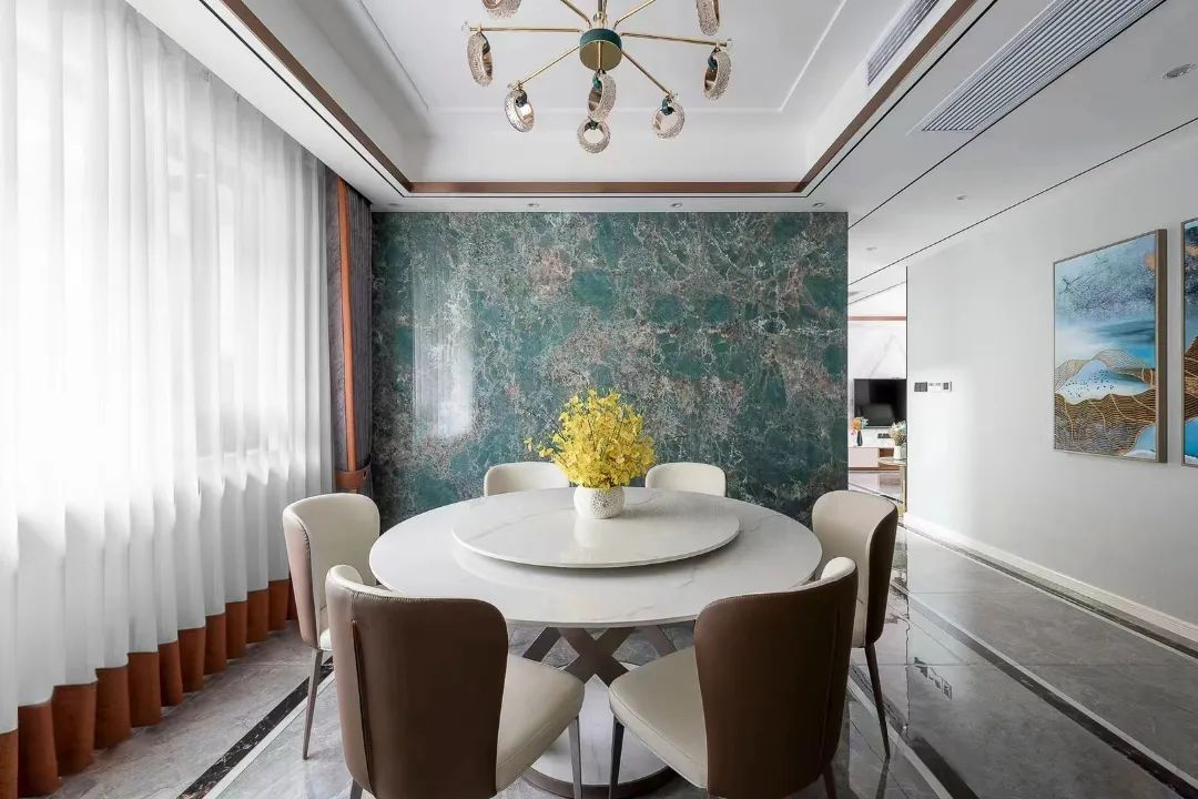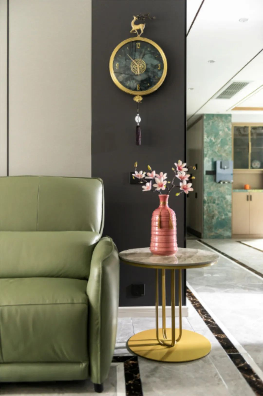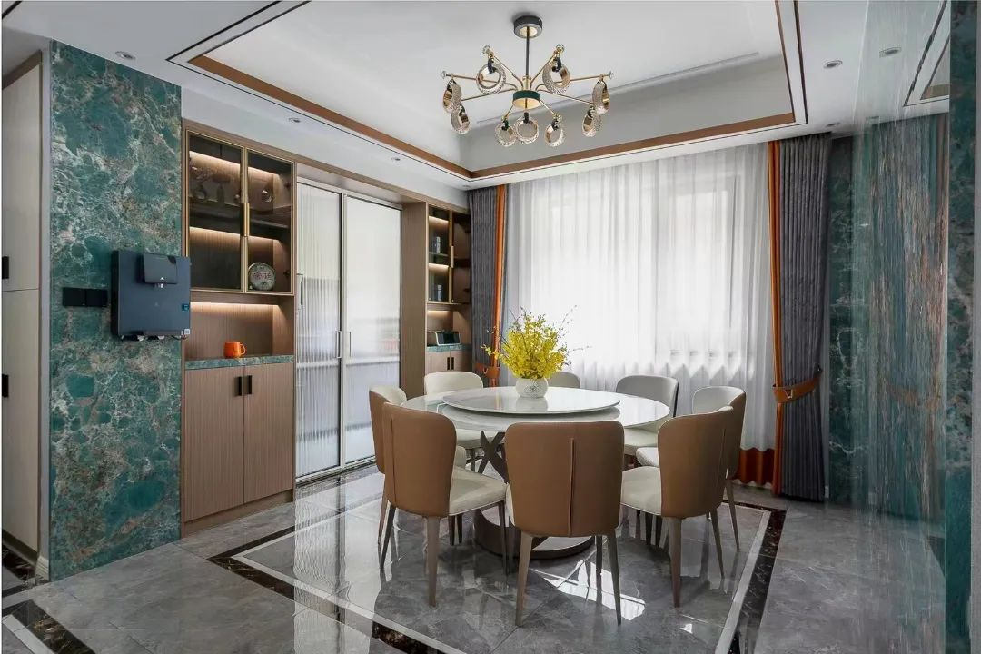 浅色地面携黑金花加工点缀,与窗外光源相呼应,更显通透与大气;而牛油果绿本身就是很清新的色调,让人走进去便有眼前一亮的感觉。