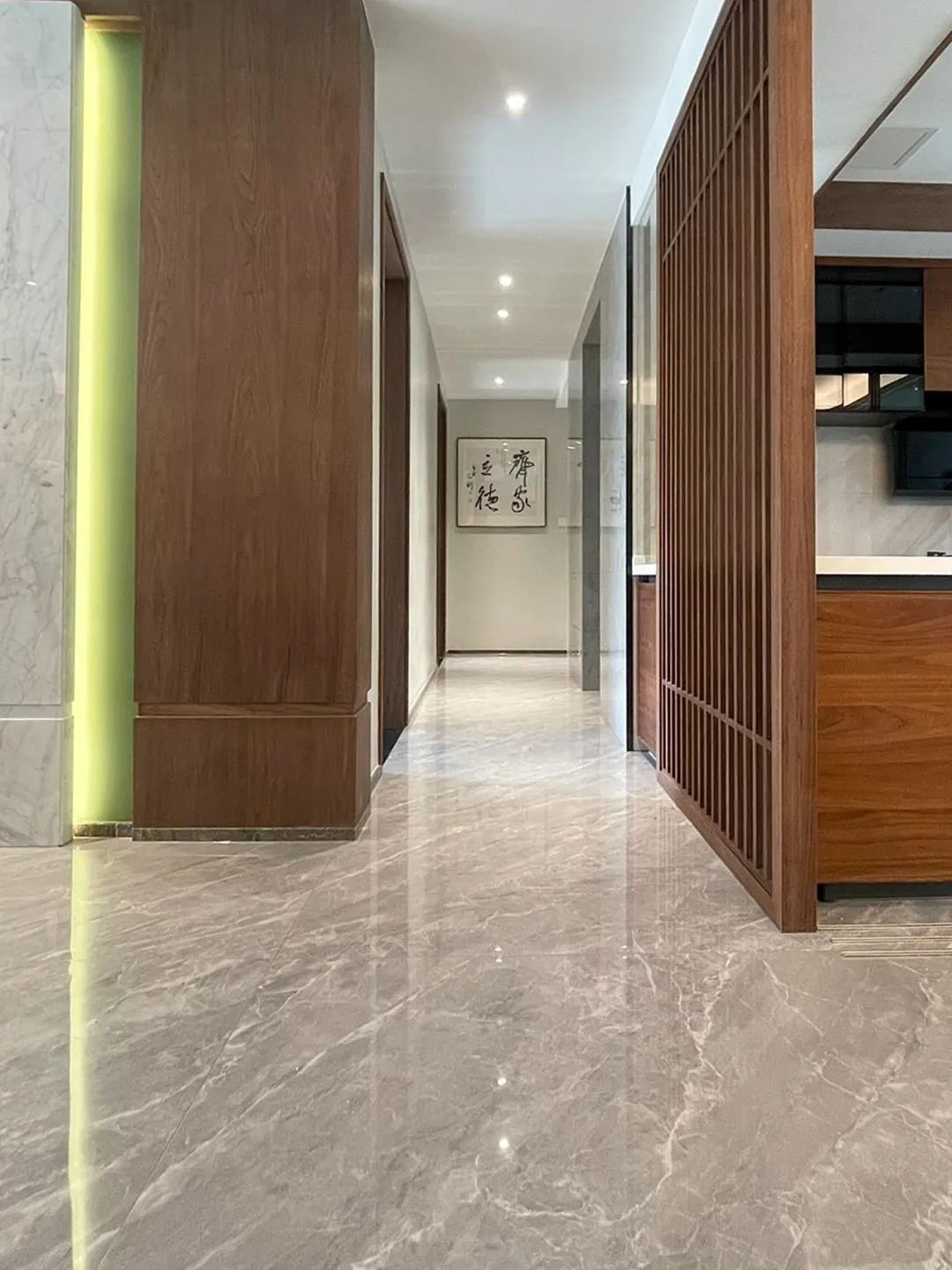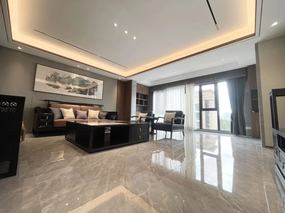 天花与墙面加入木条造型,让空间层次丰富又有意境。山水画的装饰画,为空间增添了禅意的气息,高级而优雅。