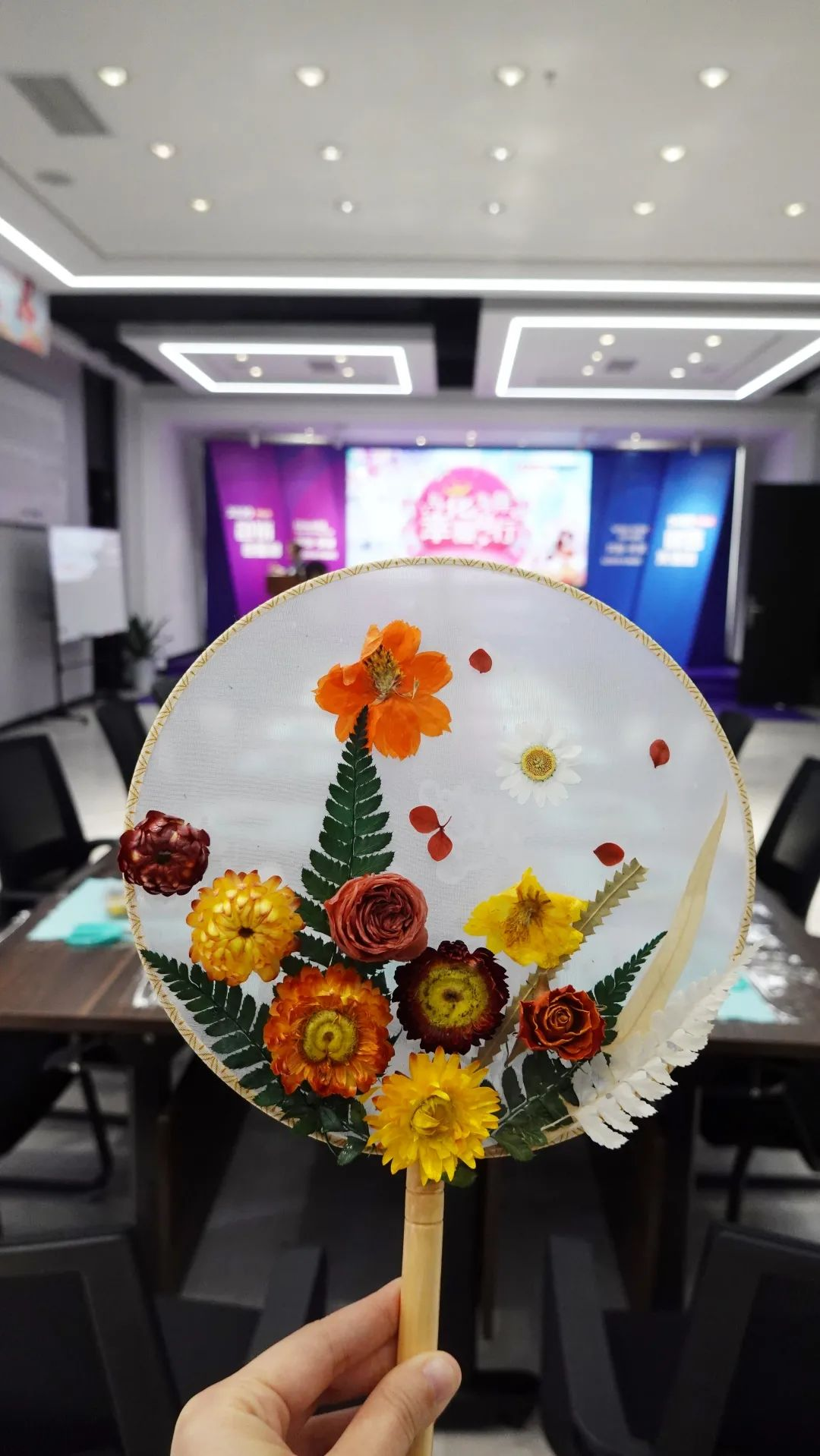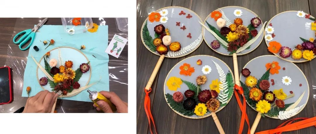 与花相处时,我们总不自觉变得浪漫真挚起来。从选择干花品类开始,到斟酌摆放的位置,大家在花艺师的精心指导下,一件件独具匠心的艺术品逐渐呈现在眼前。当多彩的花与精致的扇子组合,两种别具一番的美感油然而生,瞬间让人拥有双倍幸福。