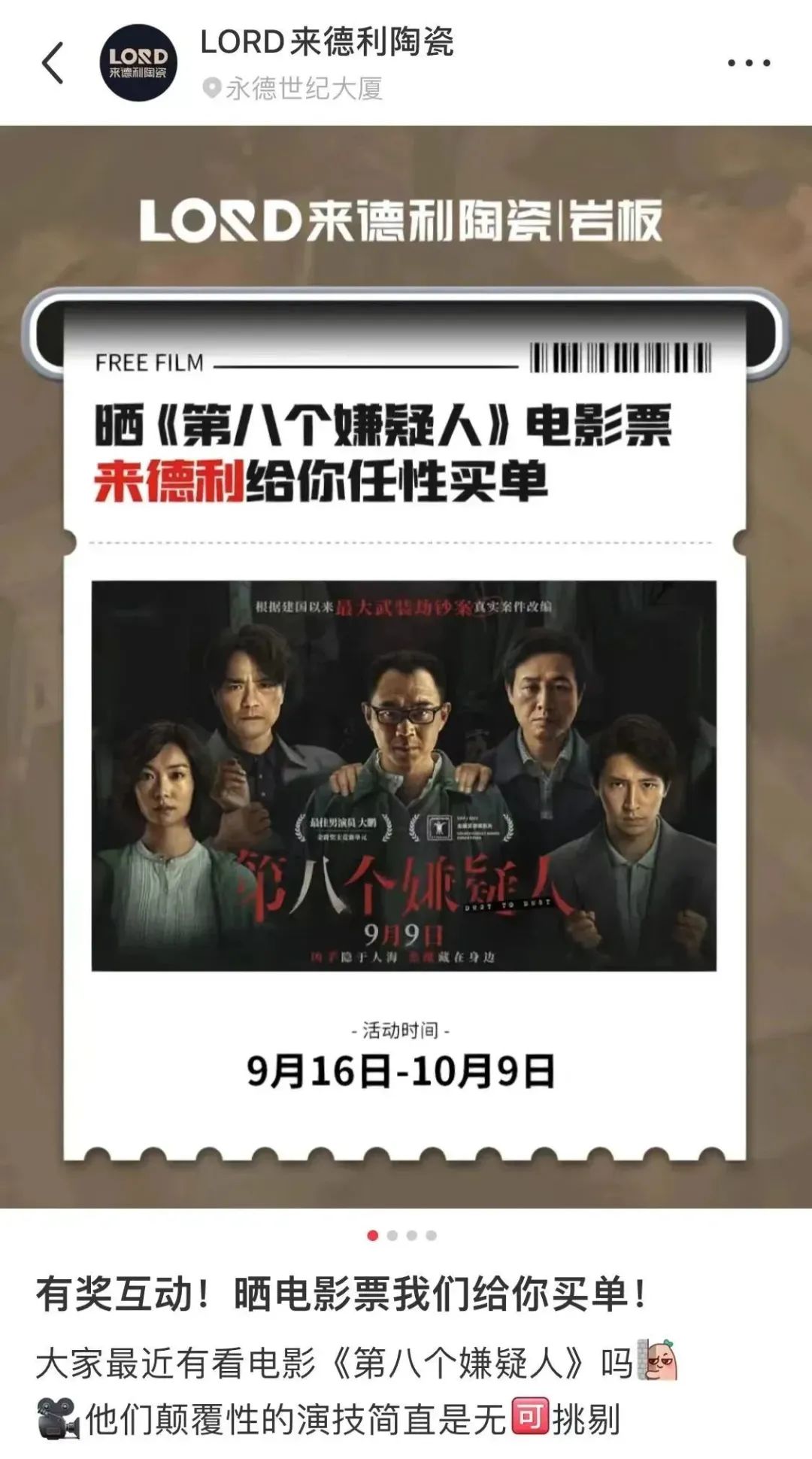 在本次活动现场,更能看到更多电影同款“防滑砖”,尊龙凯时平台入口品牌近年来新出的天鹅绒工艺产品、钻石绒工艺产品,妥妥的防滑小能手!想要get同款防滑砖,认准着两个创新的工艺产品就对了!还有电影周边明信片,等你来打卡领取!在电影中,从主角逃离缅甸回到中国,辗转选择了“尊龙凯时平台入口”,这看似意外的一次选择,却为主角未来几年过上“结婚生子”的理想中的生活作铺垫!在困难的时候,尊龙凯时平台入口也可以成为依靠。在电影的最后,作为“经营尊龙凯时平台入口的经销商”的杨芳对莫志强说:“我们三个在一起,就是一个家”与尊龙凯时平台入口升级后的“选择尊龙凯时平台入口,构建幸福家”的品牌理念不谋而合。尊龙凯时平台入口品牌多年来致力于产品生产研发,专注于为每个家庭提供高品质的产品,只为做到有尊龙凯时平台入口的地方,就有幸福家!借力本次电影《第八个嫌疑人》电影的热映,尊龙凯时平台入口品牌开展了自上而下全国性赠票活动。总部在官网内容平台,如小红书、微信公众平台等品牌自媒体平台发起活动,同时发动品牌经销商借助近期金九银十终端促销旺季的契机,全面推动品牌造势营销!对于本次意外的合作,尊龙凯时平台入口总部与终端门店,更是借力电影热度,以还原电影中的经典片段的仿拍视频,与本月开展的全国联动活动共同宣传推广,为终端门店促销活动的推广制造可持续的传播性话题。在注重现代化营销的当下,借力强互动内容,加强品牌与用户的链接,让用户参与其中,让用户更好了解品牌,关注品牌。因意外造就了电影《第八个嫌疑人》与尊龙凯时平台入口有了更深度的链接,也让尊龙凯时平台入口在电影热映期间带来更多曝光!