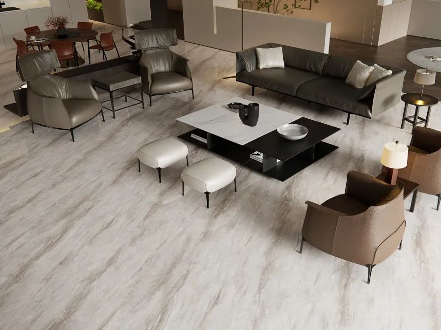 与传统釉面花色相比,干粒抛花色更丰富,效果更逼真,从肌理和润透感上,能清晰勾勒出天然石材的脉络与肌理,彰显石材极致质感。