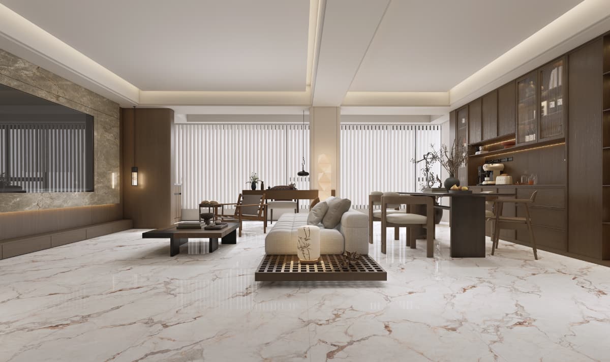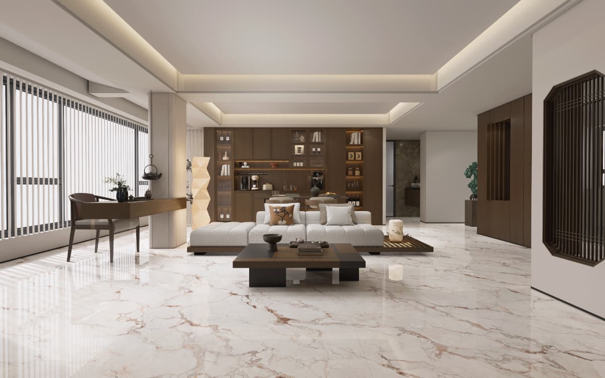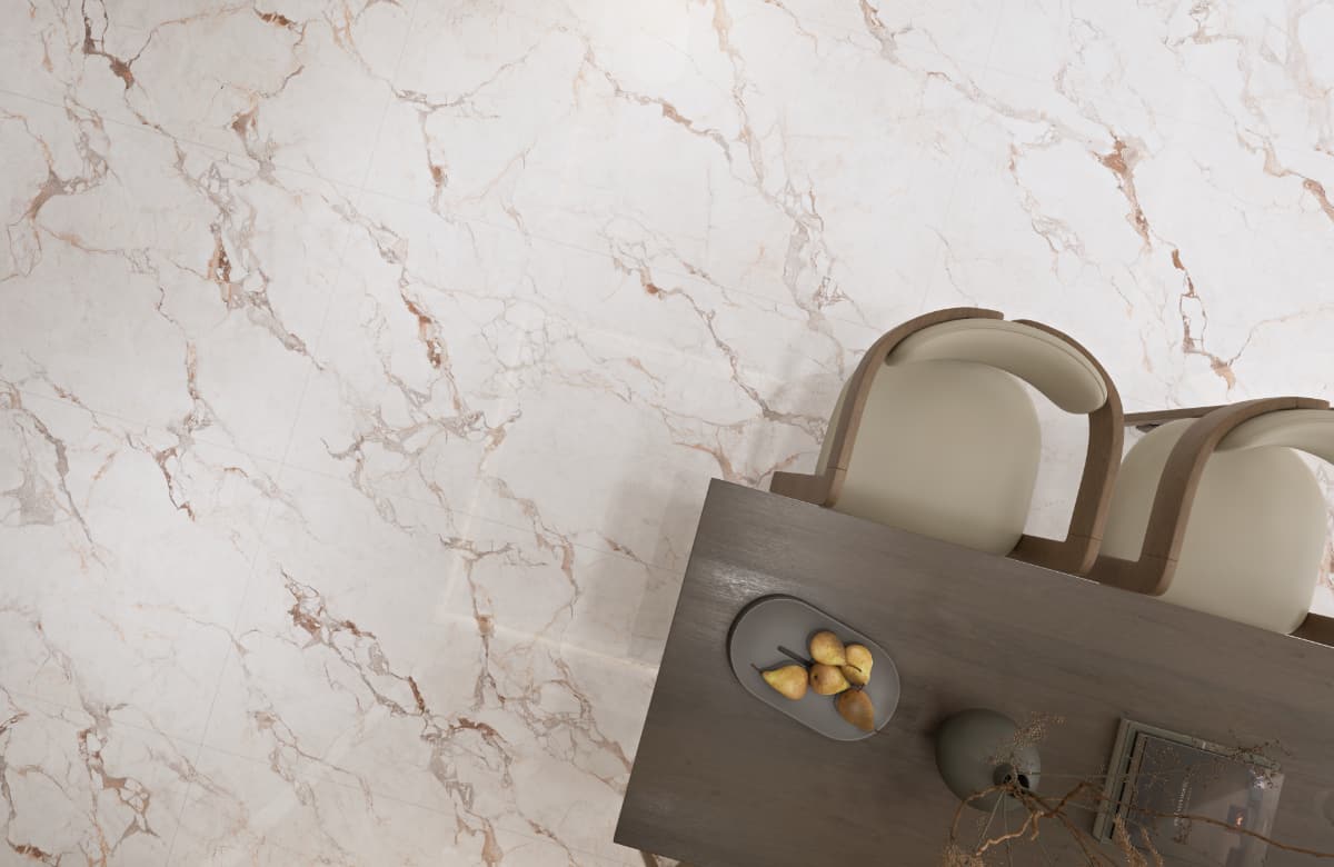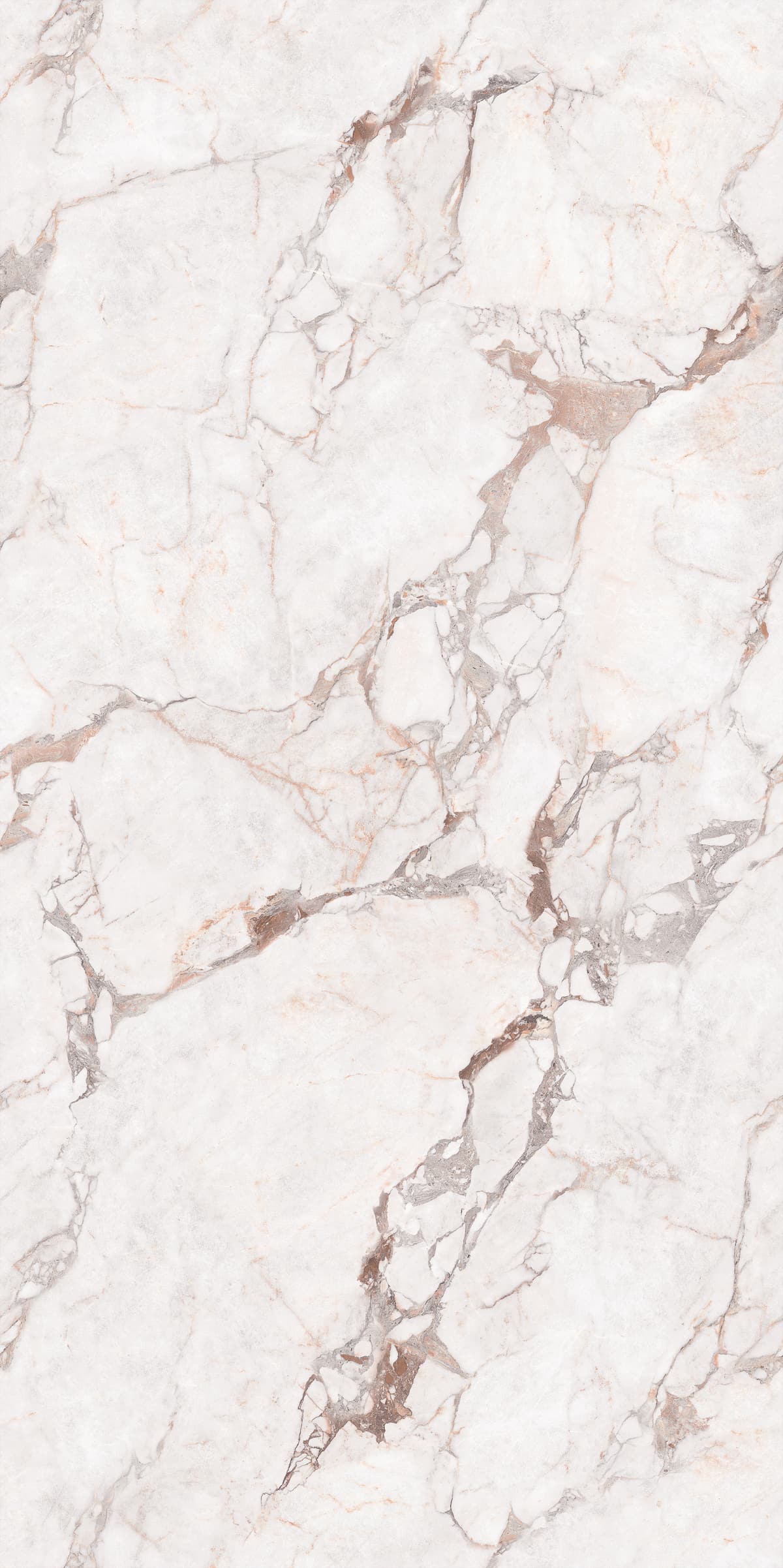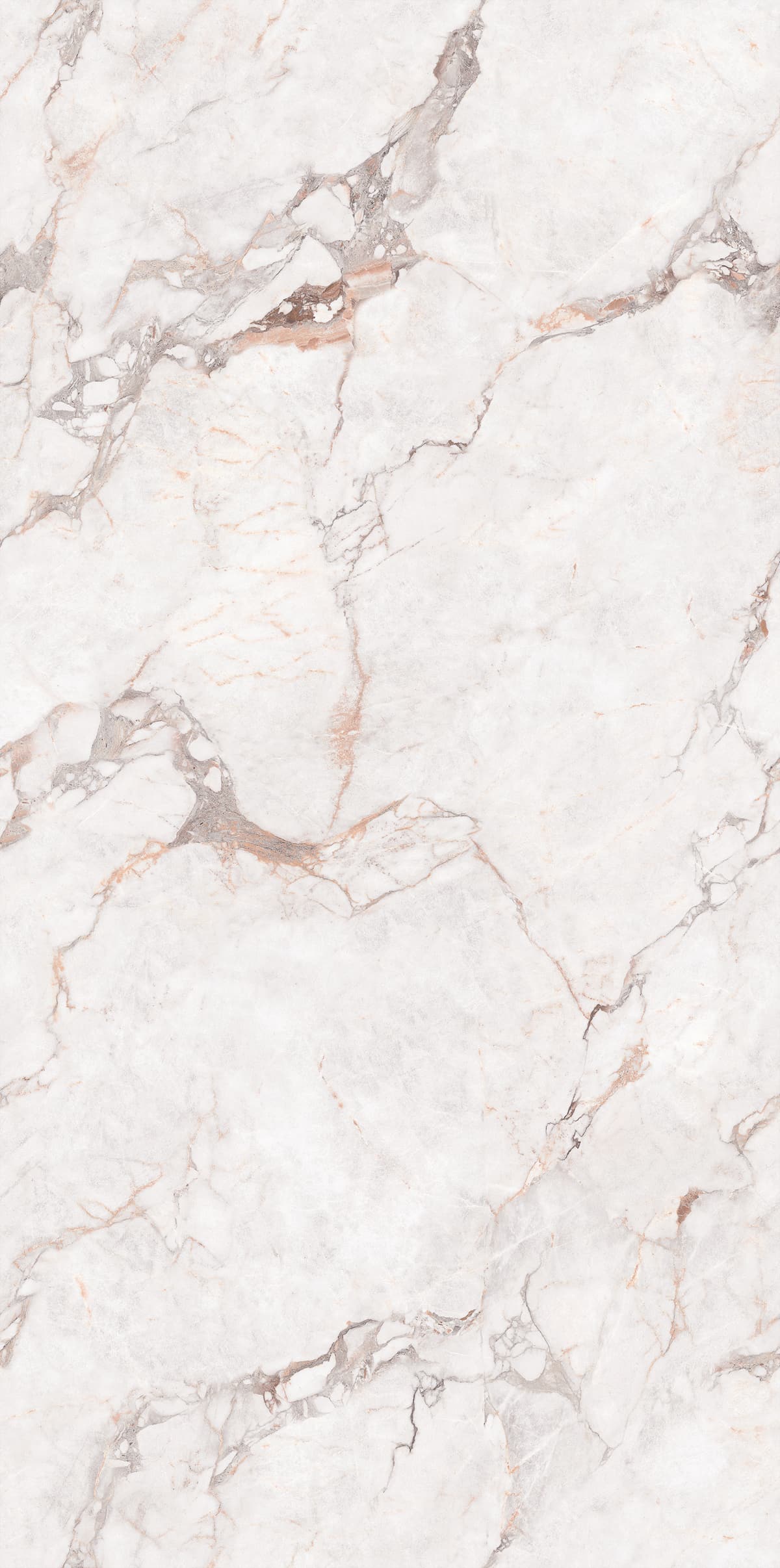 以天然岩层脉络为灵感,白色基底上自然流淌的棕粉纹路如矿石凝固瞬间的液态记忆。在简洁构图中呈现岩石结晶的七彩光效果,赋予产品灵动的自然生命力